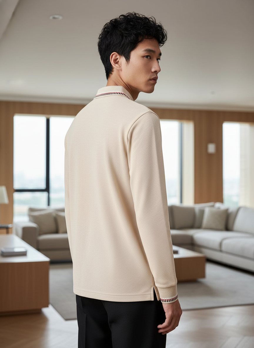 The soft cotton material offers all-day comfort, while the ribbed collar and cuffs add a polished touch. Perfect for cooler weather, office-casual outfits, travel, or weekend outings—this versatile long-sleeve polo pairs effortlessly with jeans, chinos, or tailored trousers.