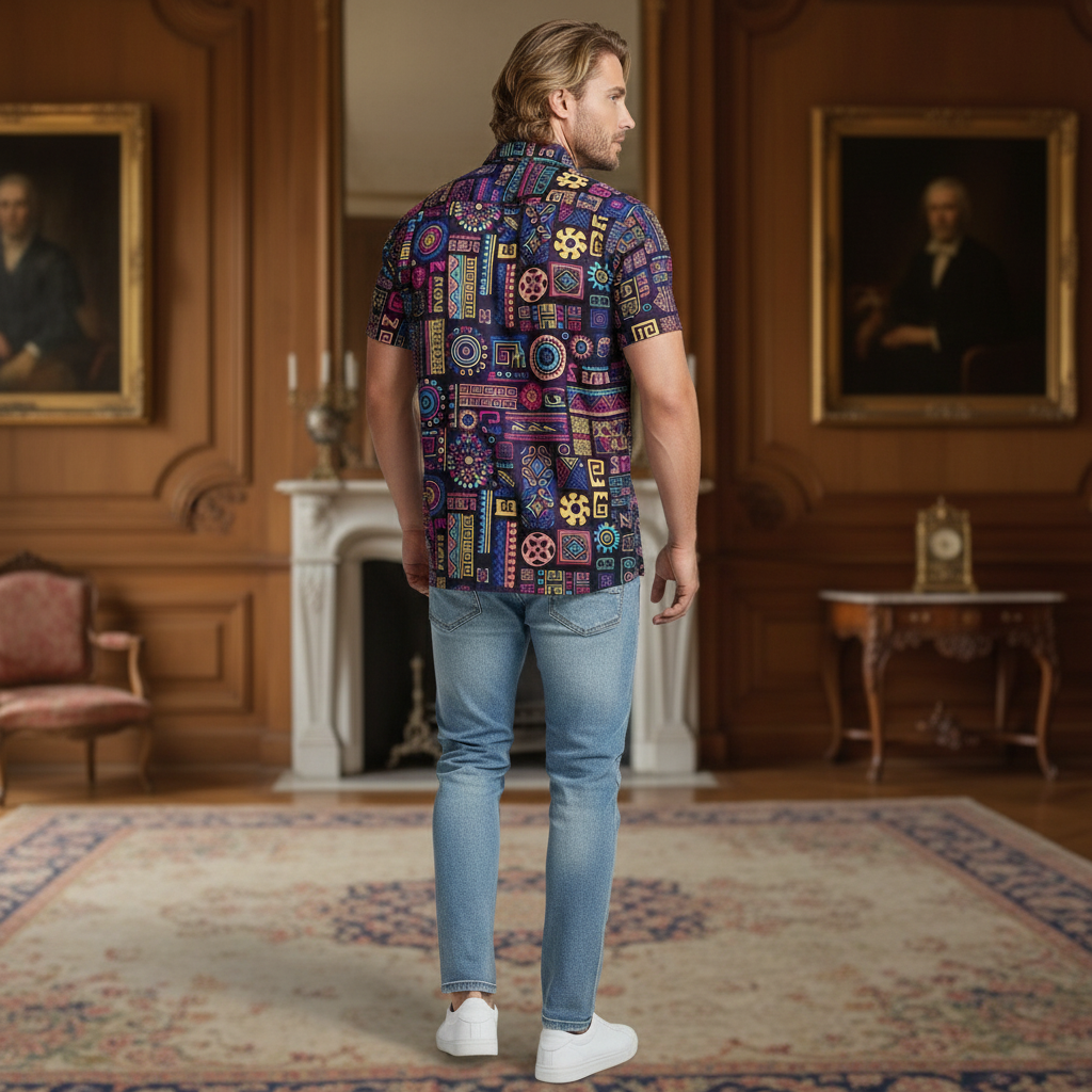 Turn up your style with this premium men’s geometric print shirt, crafted from soft and breathable rayon for all-day comfort. The bold multicolor pattern brings a creative, modern edge that instantly stands out—perfect for parties, outings, vacations, or any moment when you want your look to do the talking.